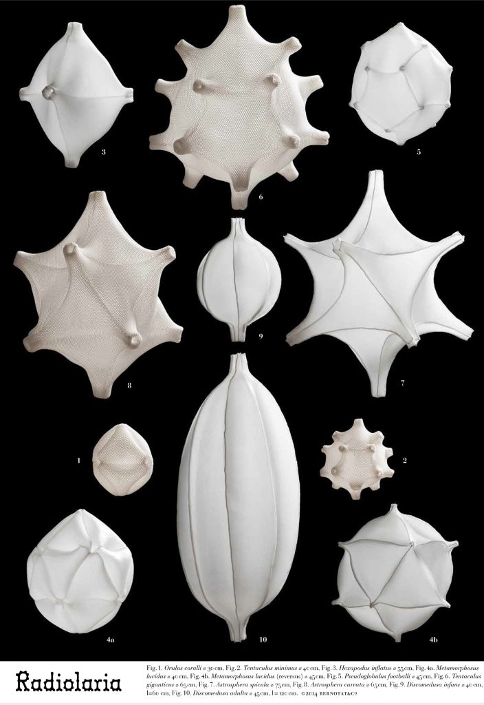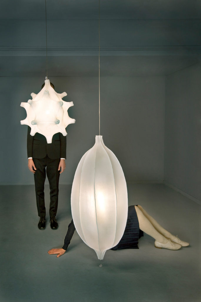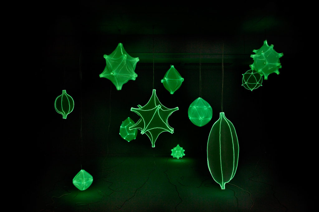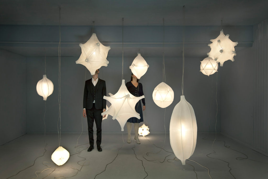 The Radiolaria are a family of eleven lamps made of 3D-knitted textile with glow-in-the-dark seams, inspired by the phenomenon of bioluminescence and the microscopic organisms discovered by German scientist Ernst Haeckel. When the light is switched off, the Radiolaria leave a mysterious green afterglow. Each lamp has a different shape, but they’re all equally rotund and strangely scaleless. Are they bacteria? Plancton? Plant seeds? Or maybe planets?